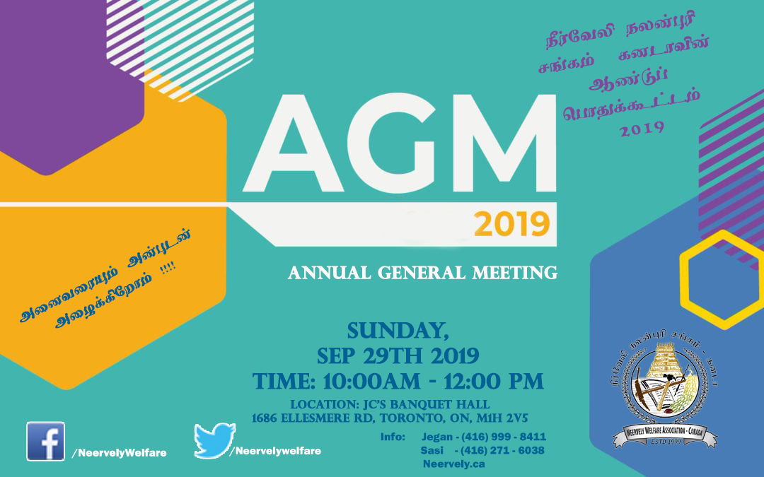 Neervely Welfare Association Canada's Annual General Meeting has been set to take place on September 29th Sunday 10 Am to 12 PM at JC'S Banquet Hall located at 1686 Ellesmere Rd, Scarborough, ON M1H 2V5. Each and every members participation and support is important and highly appreciated.