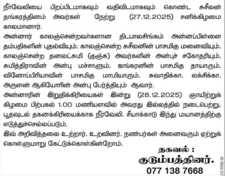மரண அறிவித்தல்: திருமதி சுசீலன் தங்கரத்தினம் (ராணி)